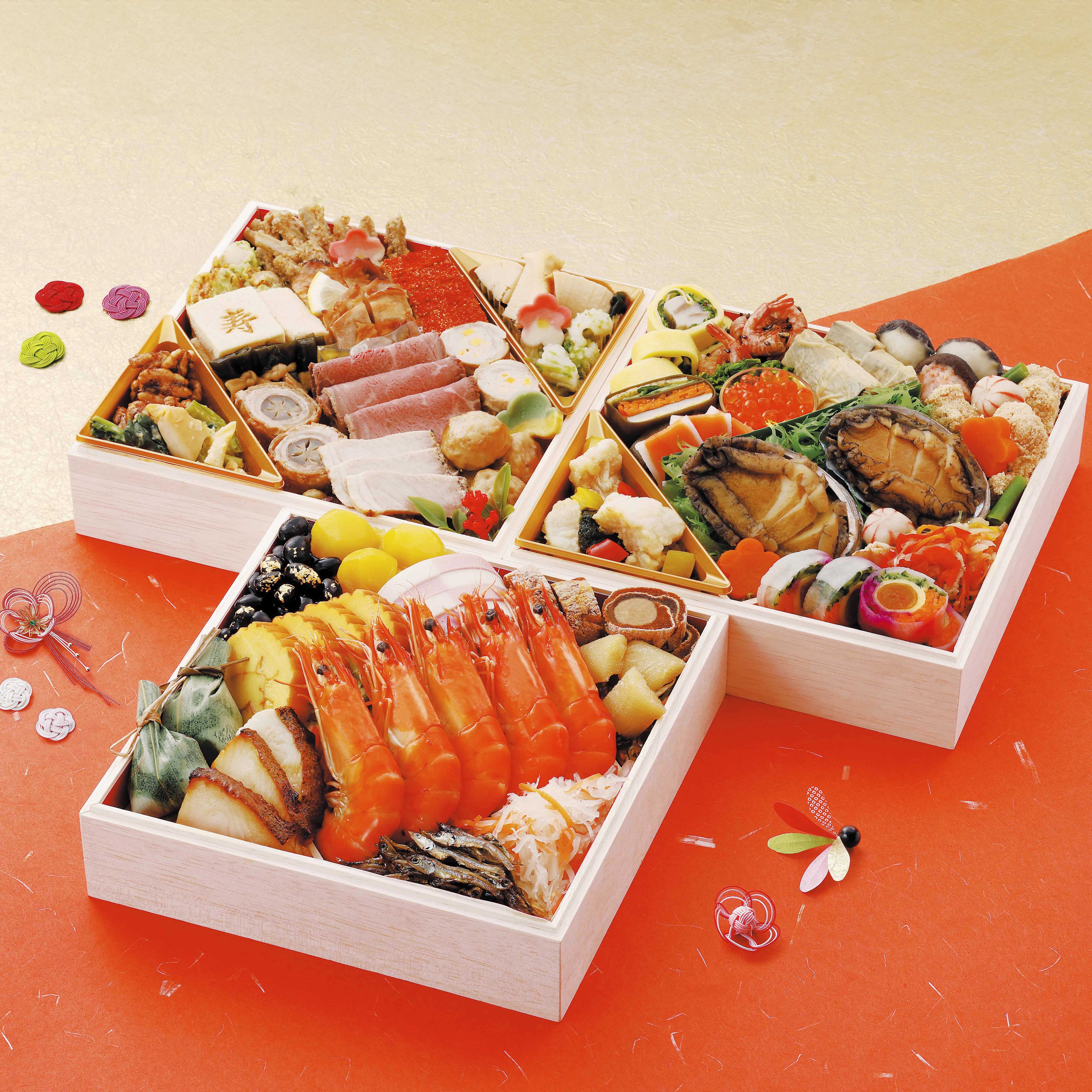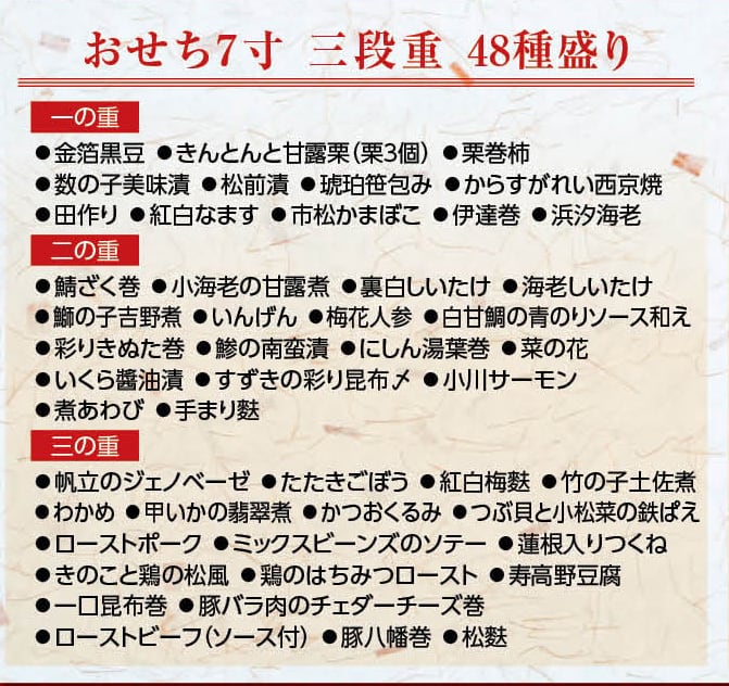 <祝箸付> 重箱3段(1段内寸190mmx190mmx40mm) 寿司屋が厳選した豪華48種盛り。 【RDCポイントカードへのポイント加算はできません】